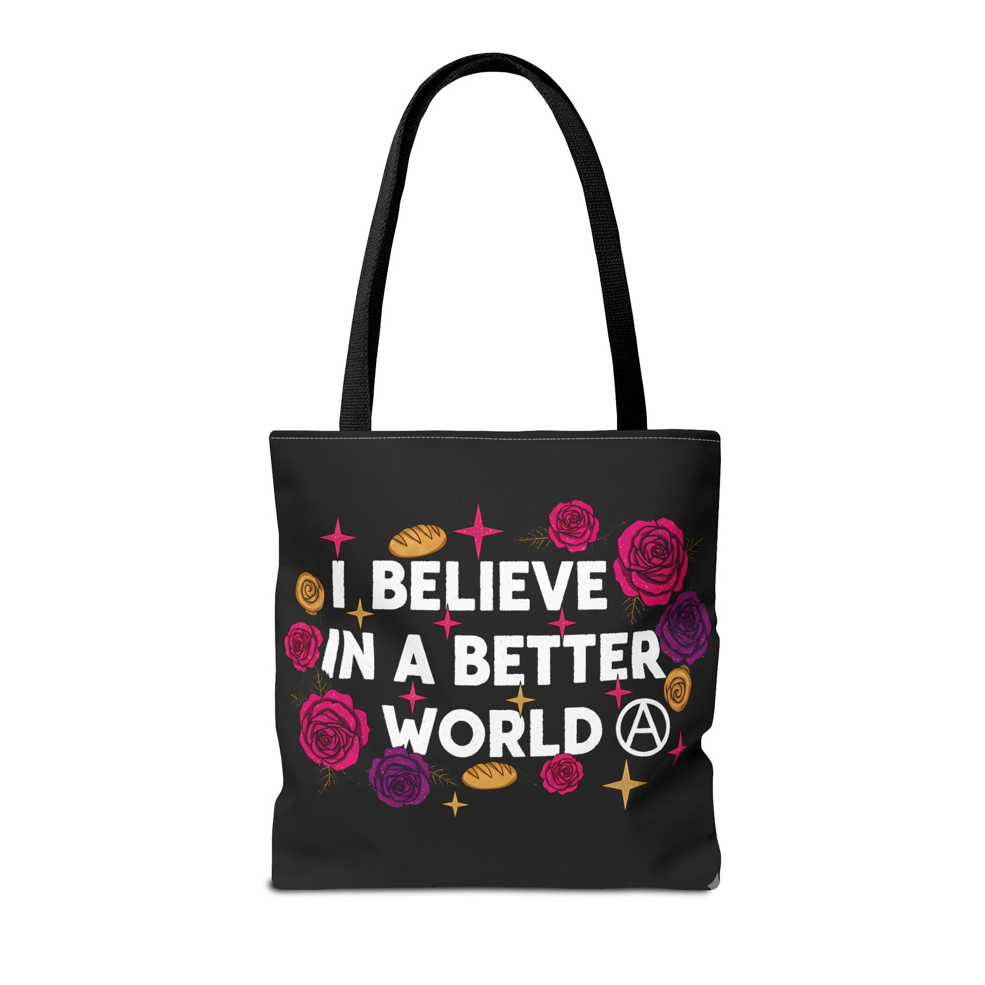 Bold, optimistic, and a little bit cheeky — this tote carries more than your groceries. Soft yet sturdy polyester holds its shape while boxed corners give extra room for books, market finds, or a spare sweater. The graphic — bright roses, little loaves of bread, and a confident declaration — feels like a late-night conversation with a friend who still believes change is possible. Black handles and matching inner stitching keep the look grounded and easy to pair with a jacket or a weekender bag. Slip it on for farmers’ markets, protests, study sessions, or errands when you want your bag to say what you won’t. It’s lightweight, quick-drying, and built to be lived in.