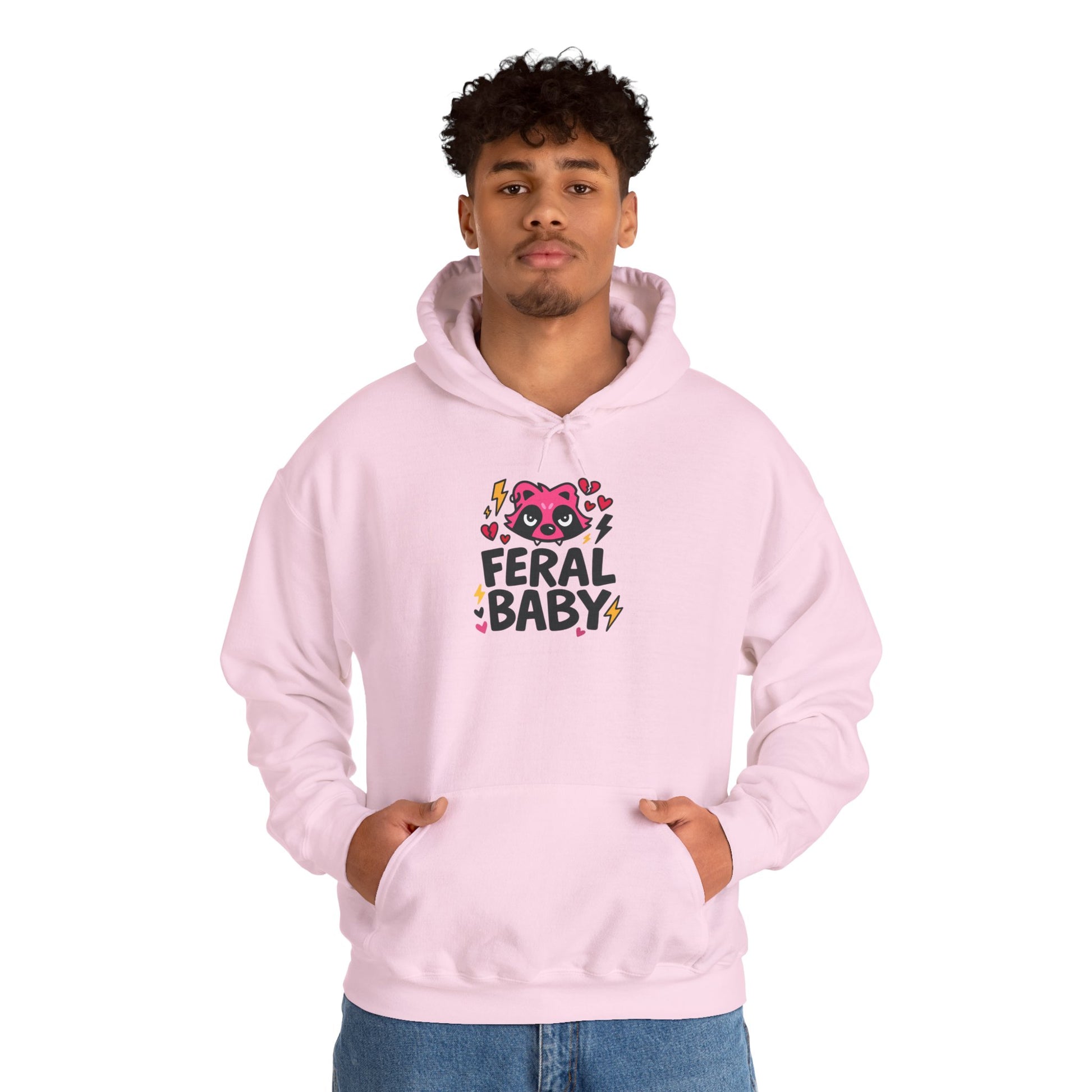 Soft, oversized warmth with a playful edge. This cozy hoodie wraps you in a pillowy 50/50 cotton–poly blend and a double-lined hood, while a roomy raccoon pocket keeps hands tucked and phone close. Centered on the chest, a bold kawaii-style mascot and the cheeky “FERAL BABY” lettering add personality — bright, a little wild, and impossibly cute. The tubular knit construction gives a smooth, seam-free body that drapes cleanly. Wear it to lounge, to layer for chilly walks, or to bring a dash of rebellious sweetness to coffee runs and low-key hangouts.