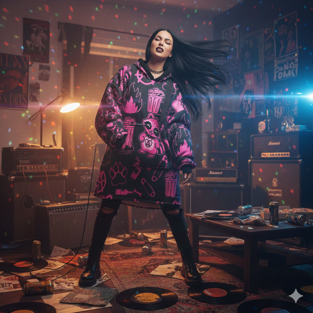 Wrap yourself in a playful, cozy cloak of attitude. This hooded blanket blends soft 100% polyester fleece with a bold, black-and-pink print of raccoons, paw prints, trash cans, flames, and punk motifs. It feels lightweight against the skin while still keeping you warm on cool nights. The oversized kangaroo pocket holds snacks or small essentials so you can lounge hands-free. Wear it while binge-watching, reading late into the night, or settling in at a small gathering — it brings a cheeky, rebellious energy to slow, comfortable moments.